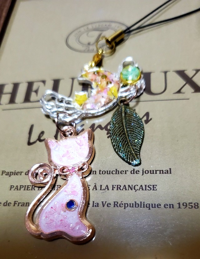 月のチャームにはカスミ草の花びらを敷き詰めて、ねこちゃんは白ベースにピンクのカスミ草の花びらとピンクのグリッターで仕上げました♪ 花に合わせて草のチャームもつけてみました。