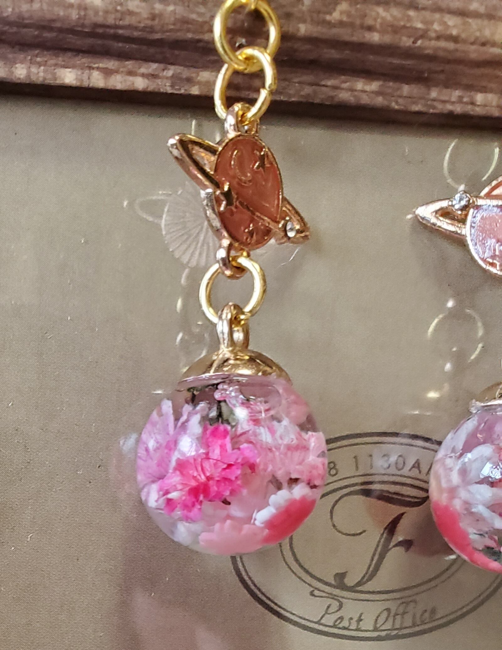 ピンク中心の花を詰めたハーバリウムの球体と惑星のチャームをつけました♪