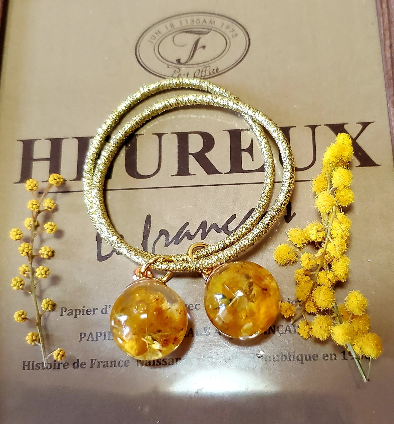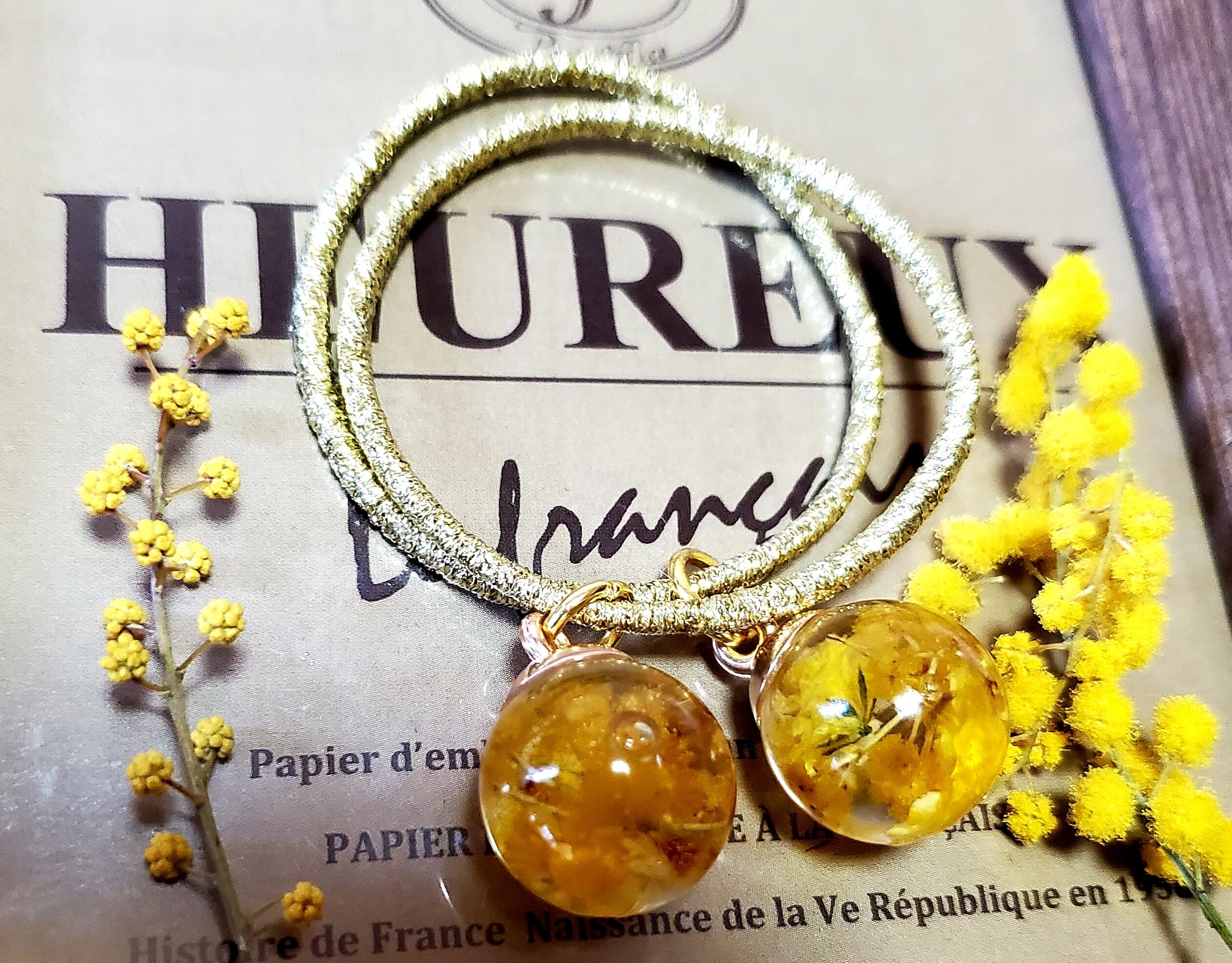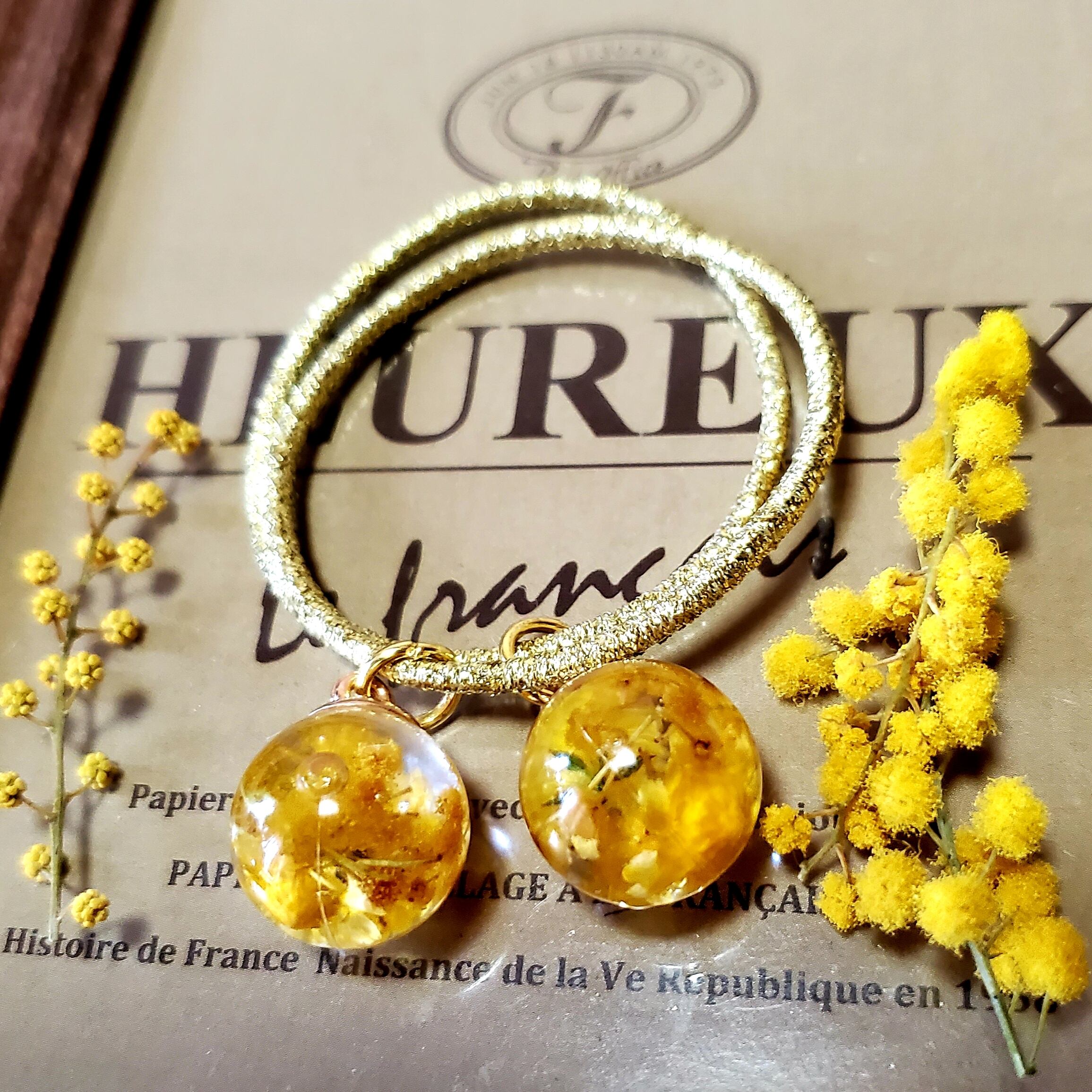 ミモザの花をたっぷり詰め込んだハーバリウムの球体をヘヤゴムにしました♪
