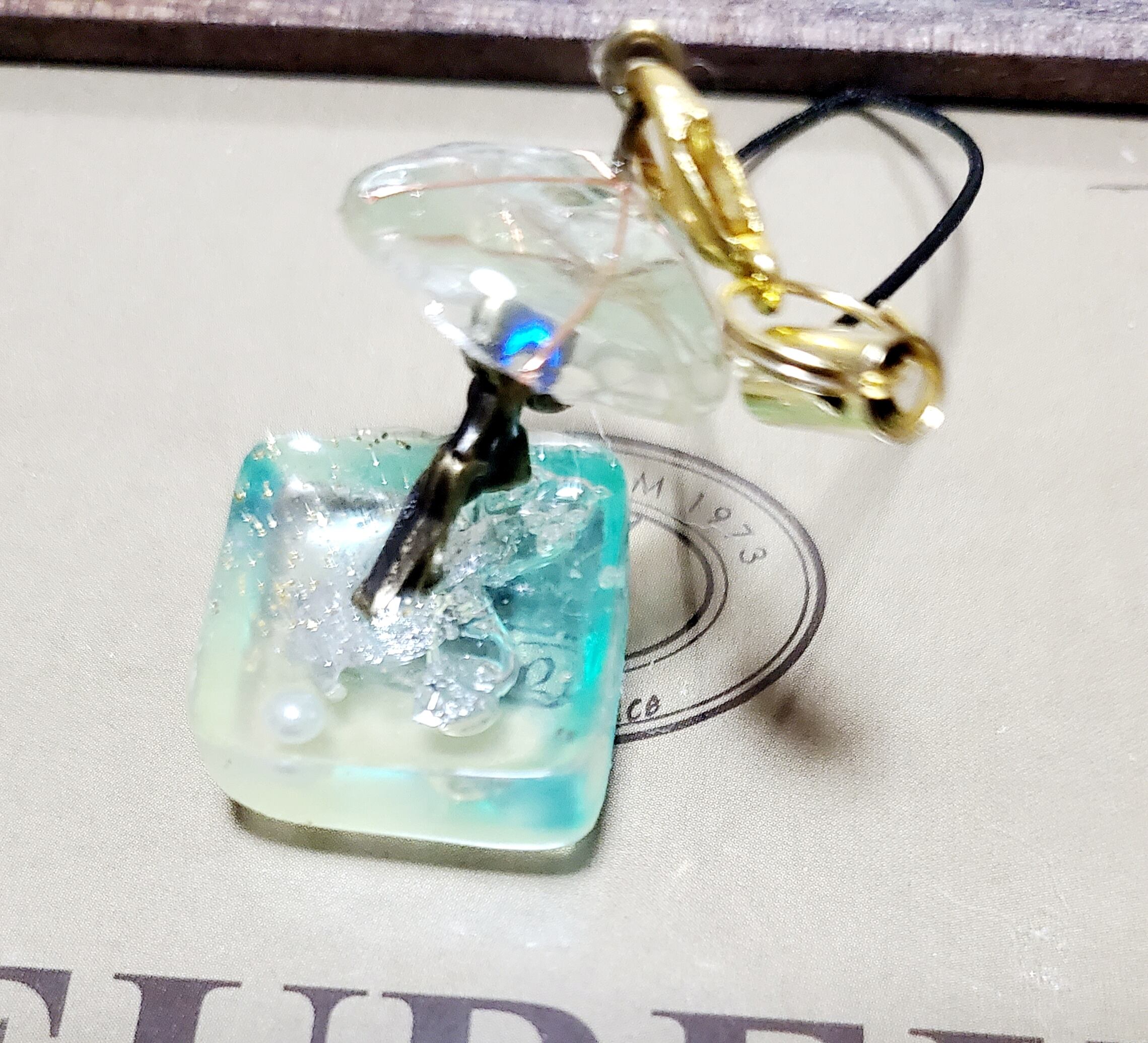 淡い緑と淡い黄色のグラデーションの泉に妖精が傘をさして、雨も楽しんでる様子をイメージして作りました。