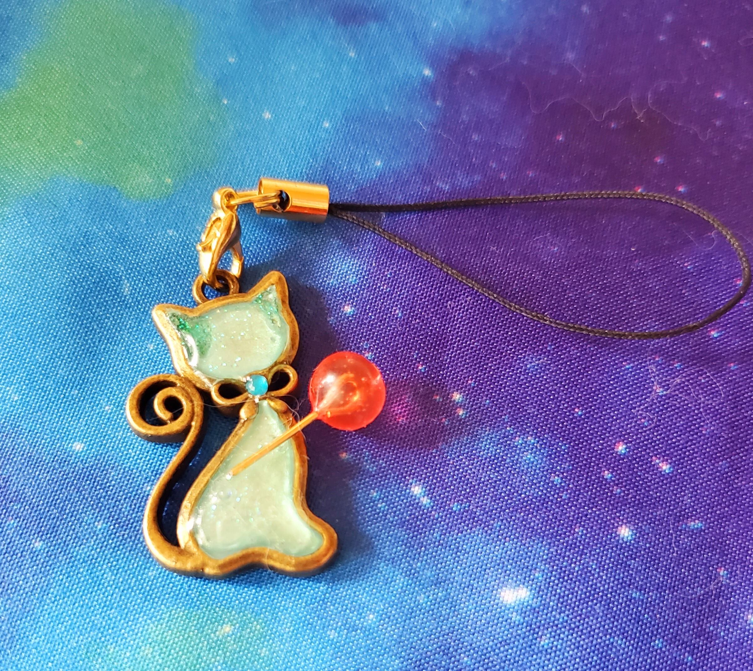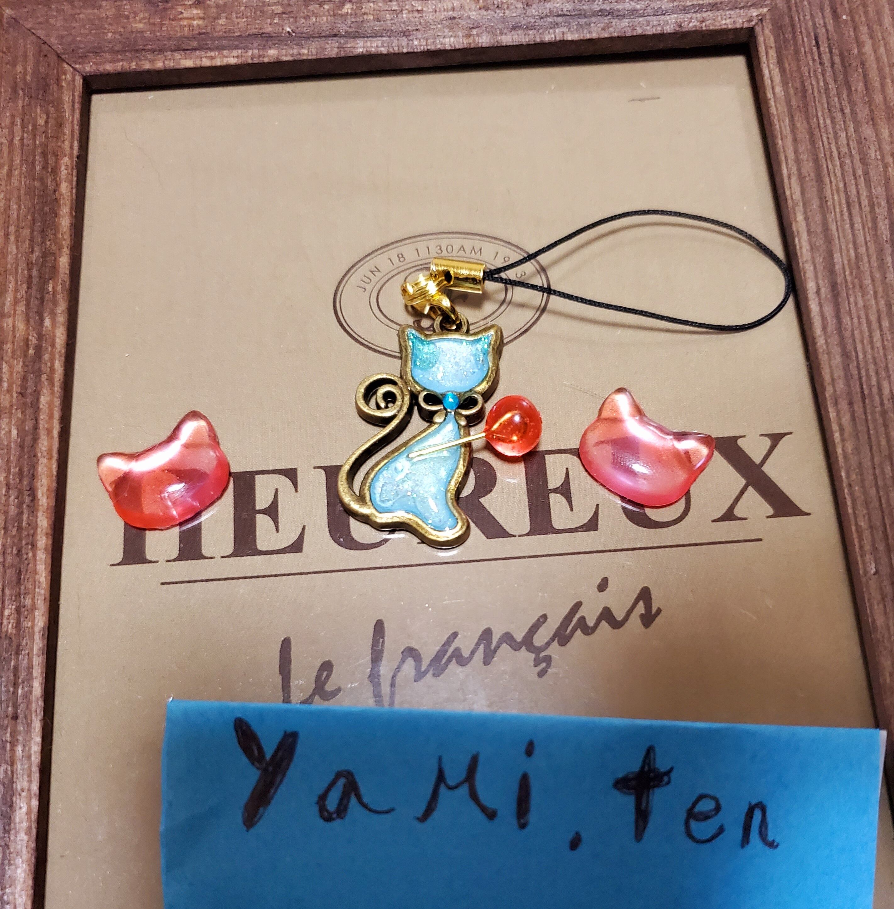 水色ベースの猫ちゃんに、ガラスのようにレジンをくるくる固めたとろけるような杖を持たせてます。