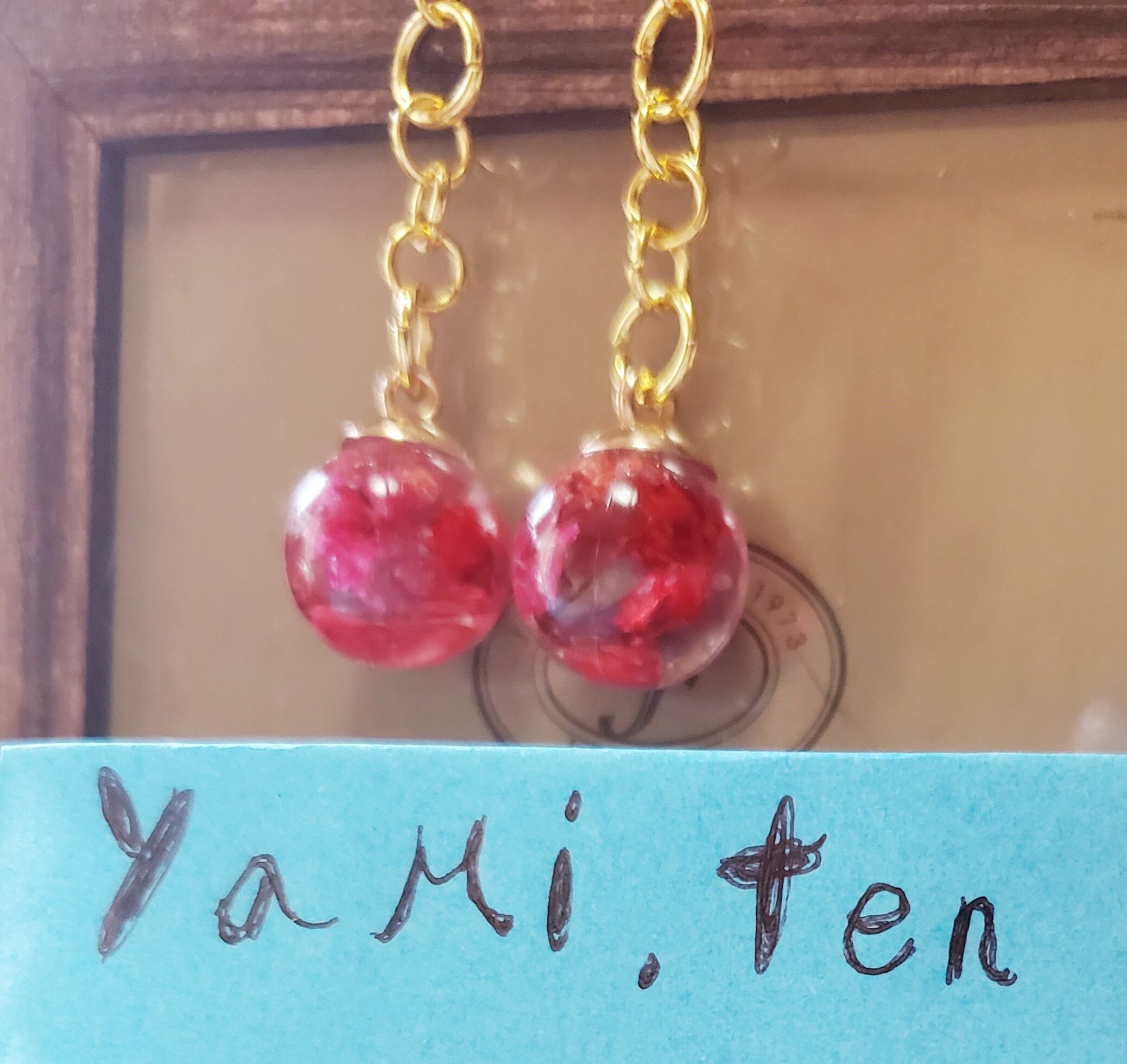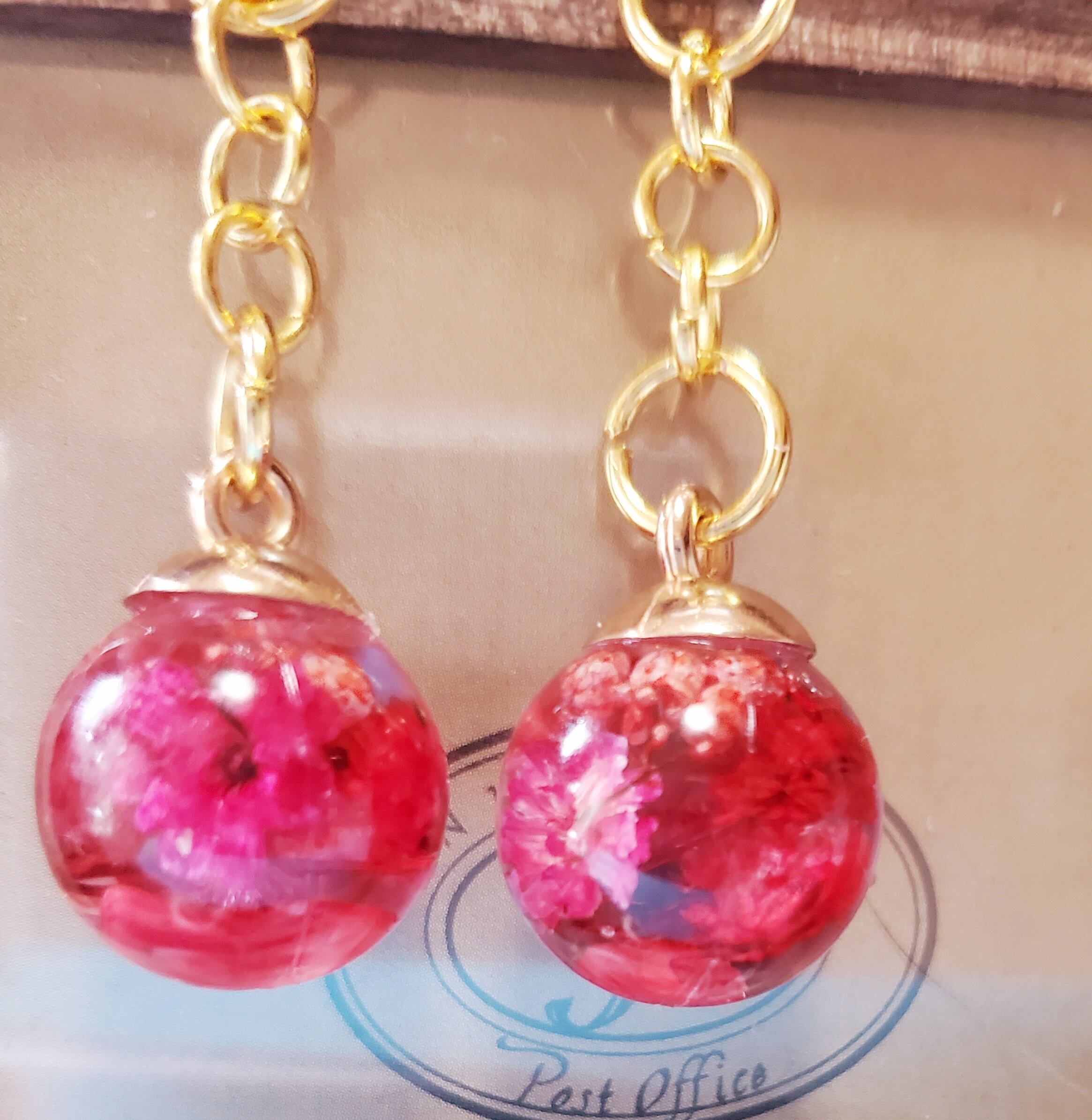 赤珊瑚を底に敷き詰め、カーネーション風の赤い花をたくさん詰め込んだハーバリウムのピアスです。