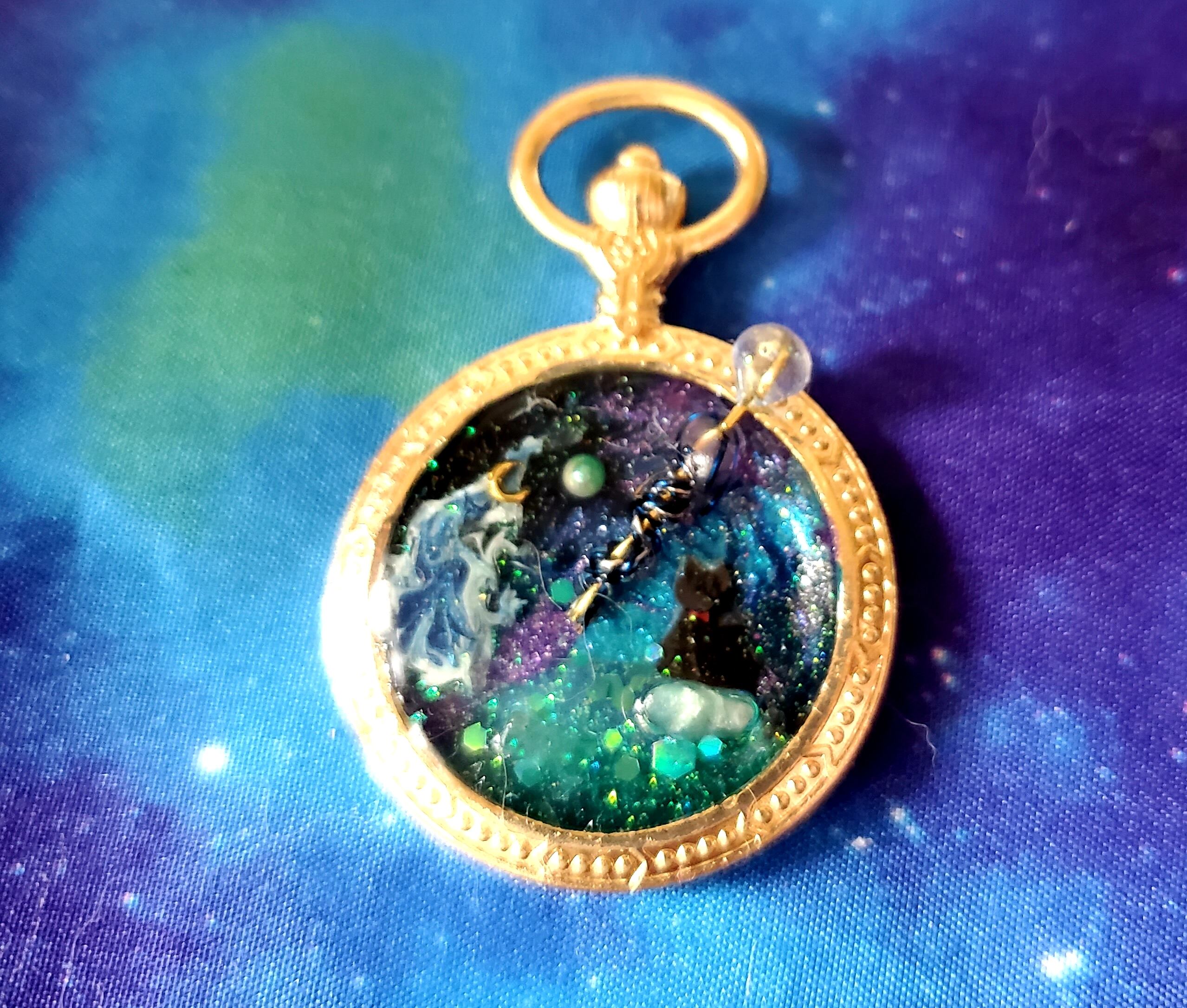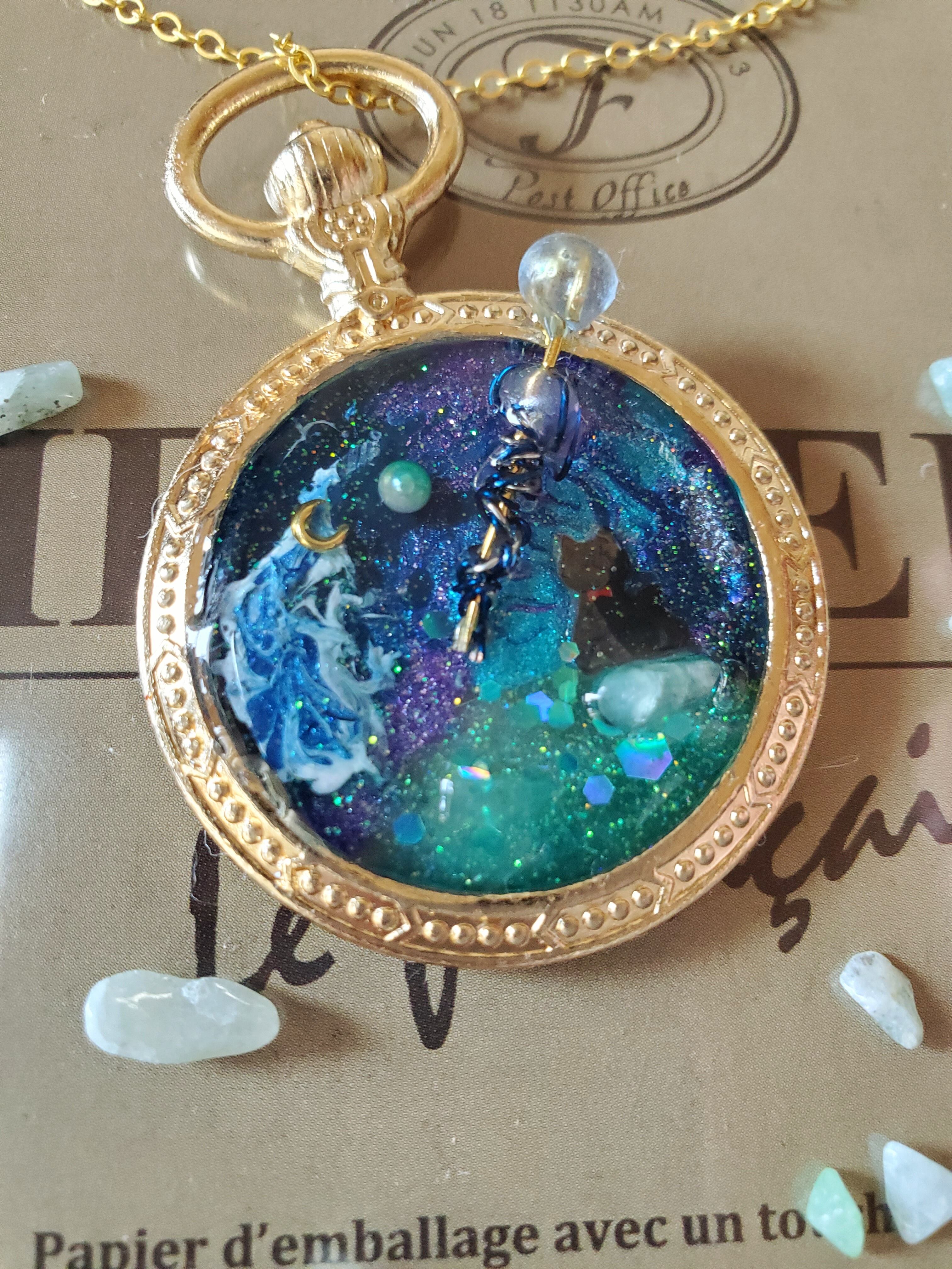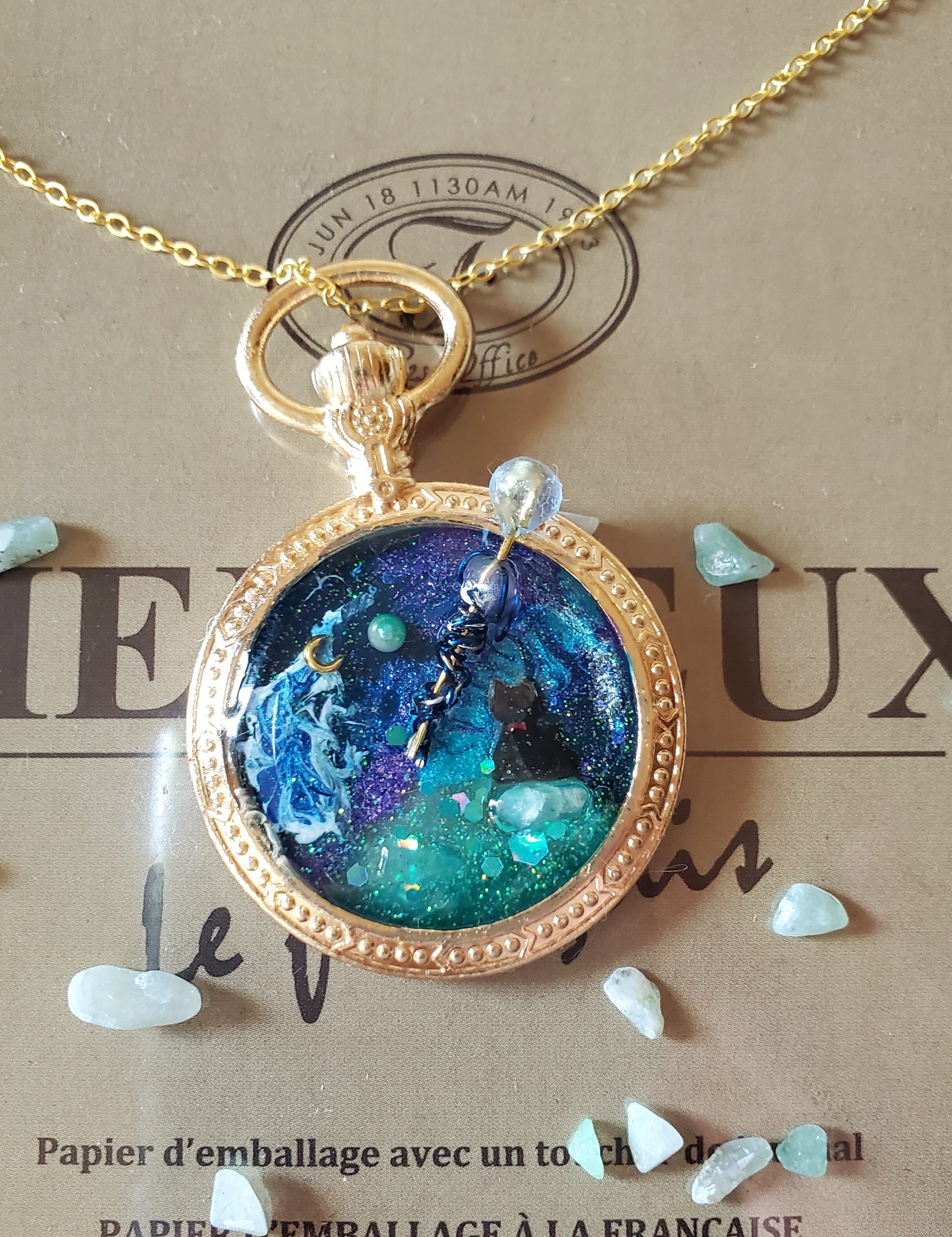 懐中時計型の土台に野原に猫が座って空を見上げてるイメージでグラデーションをしました。