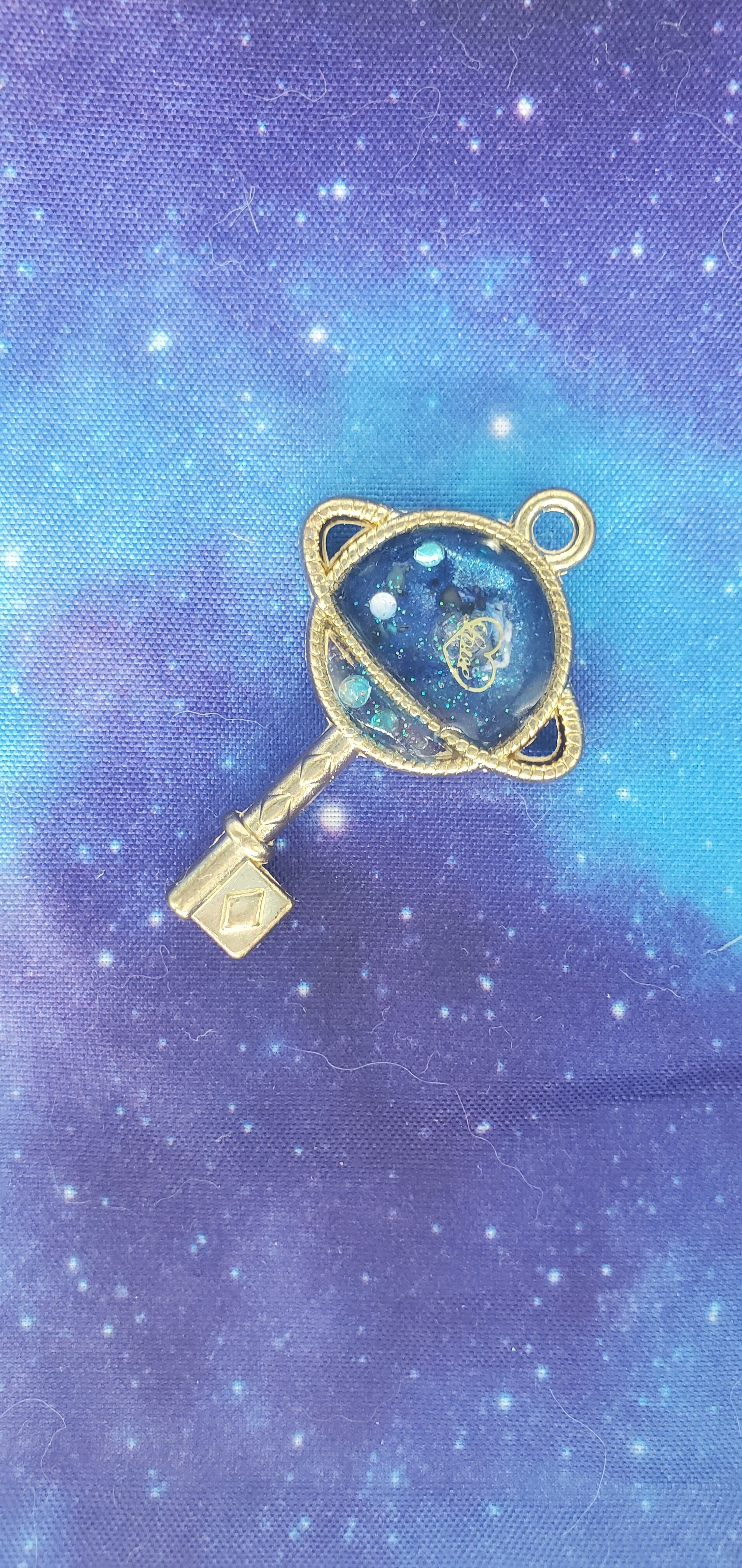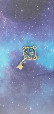 宇宙の鍵の枠に濃い青ベースにグラデーションをし、白の渦とラインストーンとの層は分けて立体的にしました。紫のグリッターを全体に塗って、ぷっくりするようにさらにレジンを重ねてます。