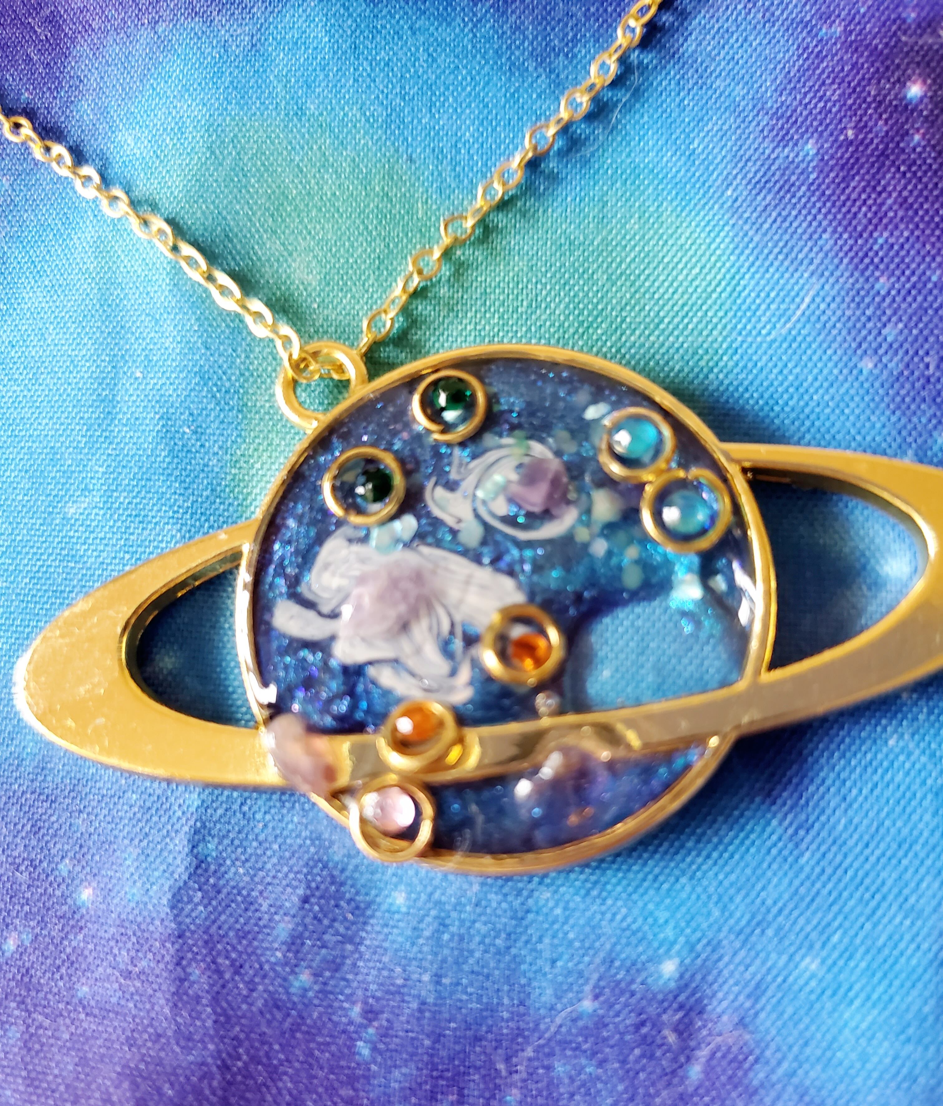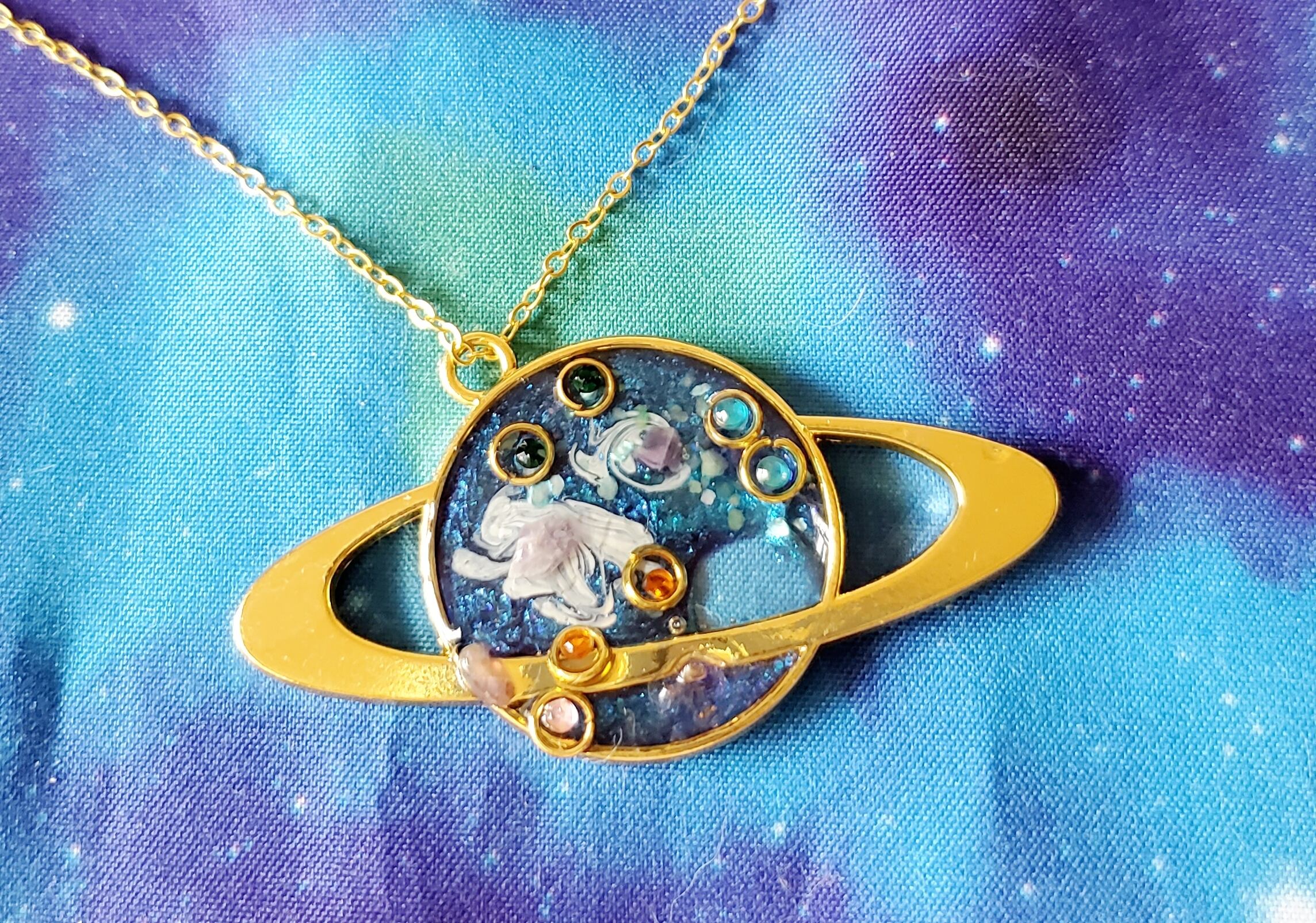 薄い青と紫をベースに色をつけ、アメジストと丸カンを散らばせて各色のダイヤストーンをちりばめて、白のグリッターで仕上げました。