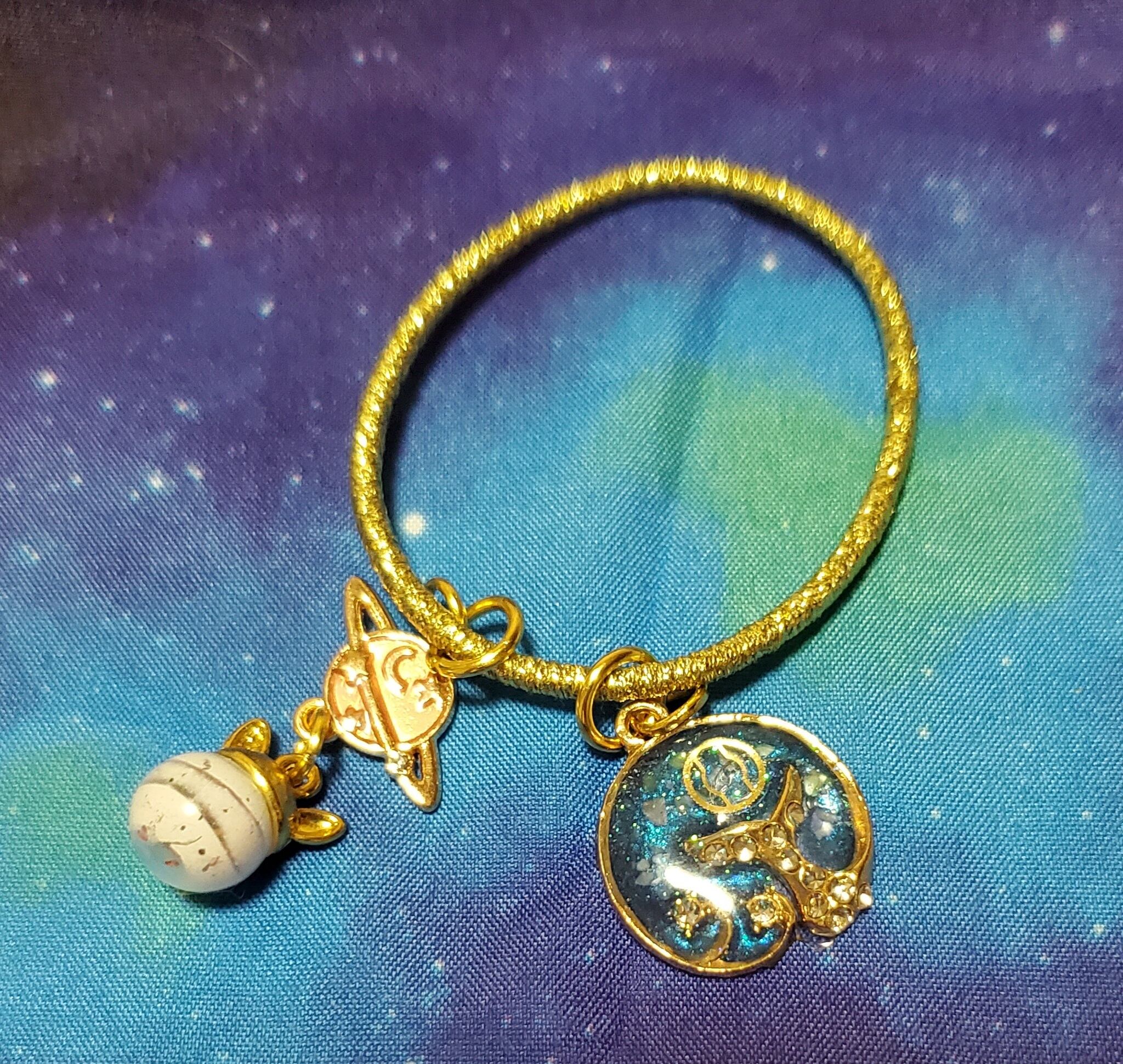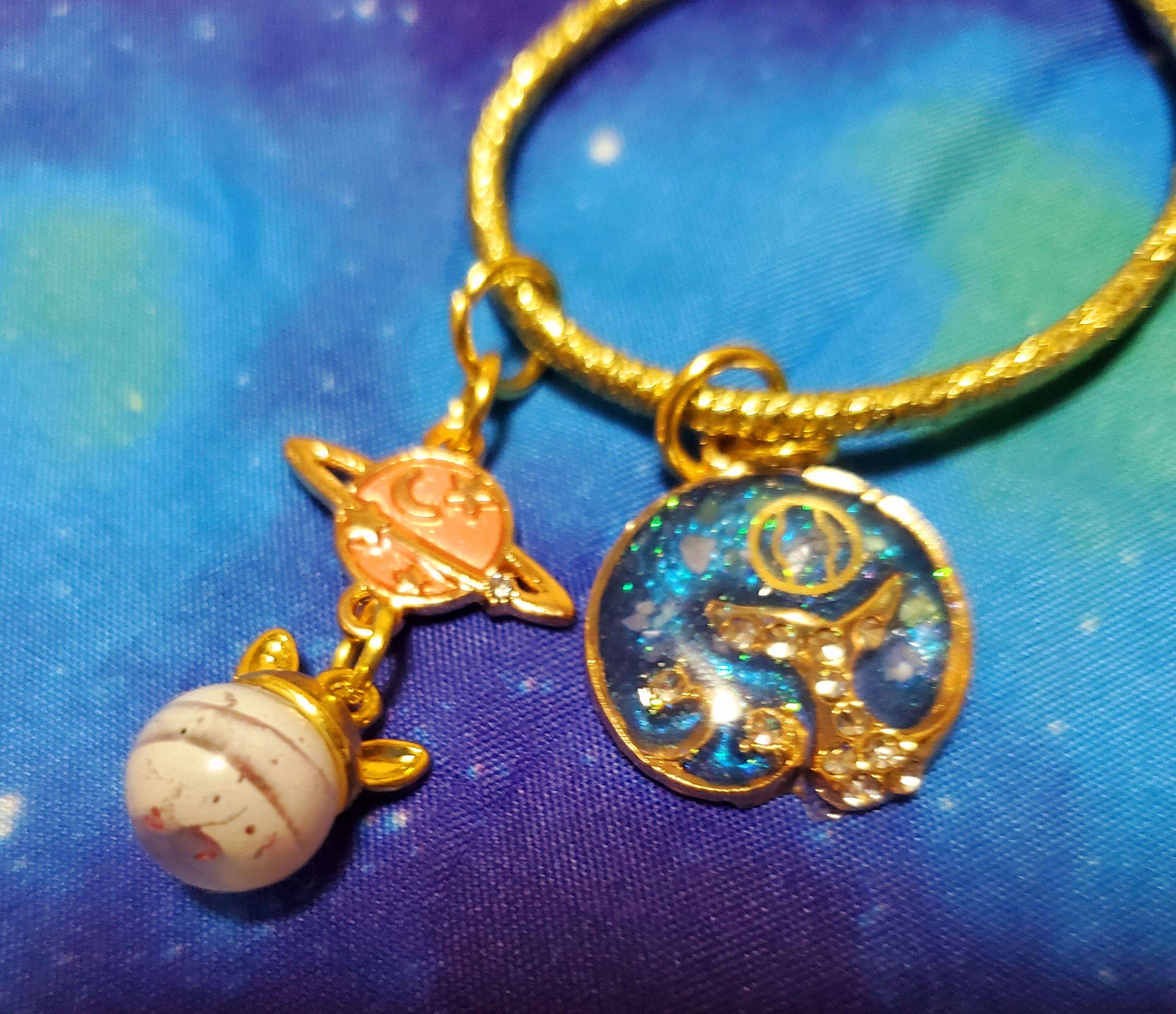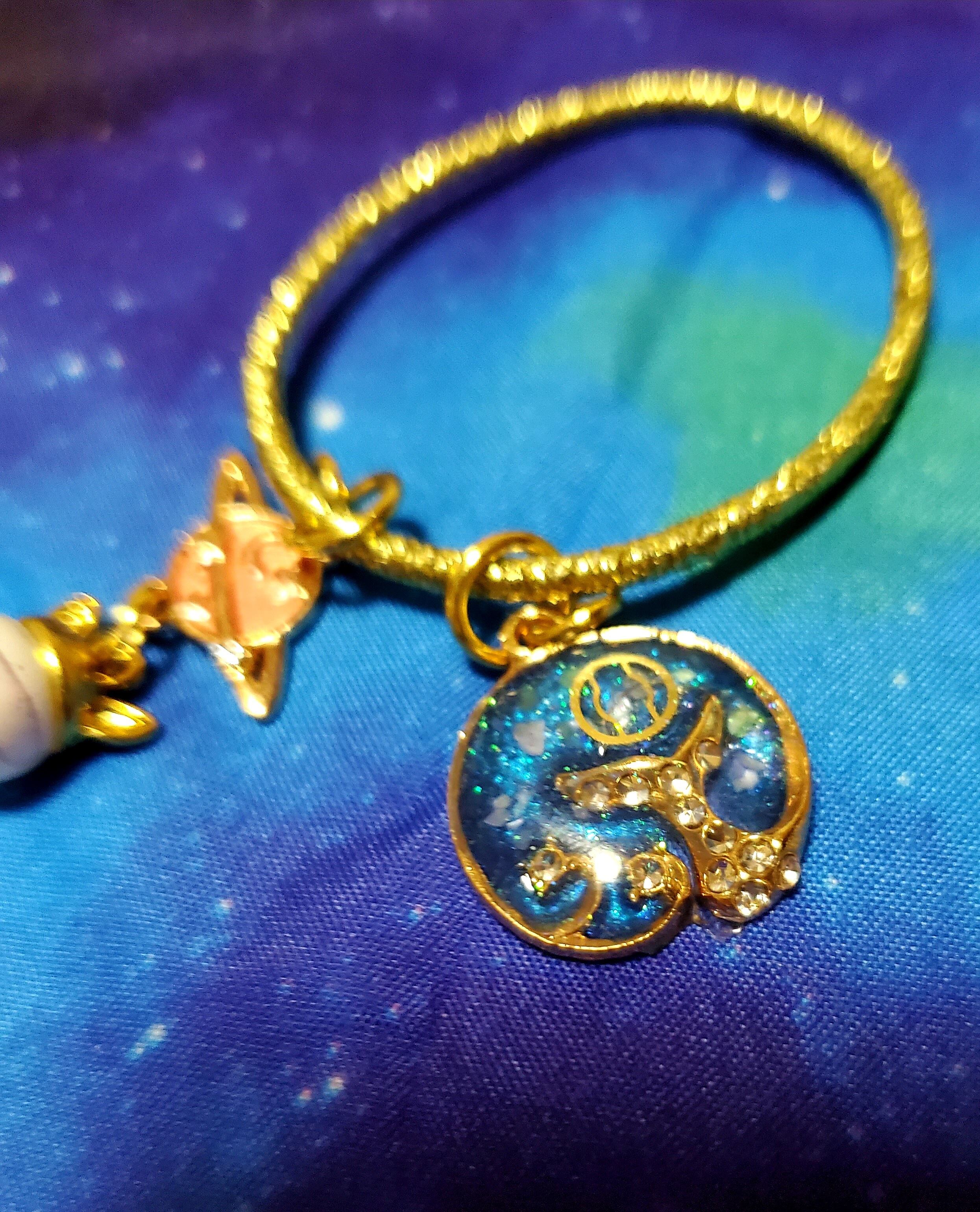 クジラの尻尾の空枠に青と紫で色をつけ、緑と青のシェルと歯車を入れて白のグリッターで仕上げました。