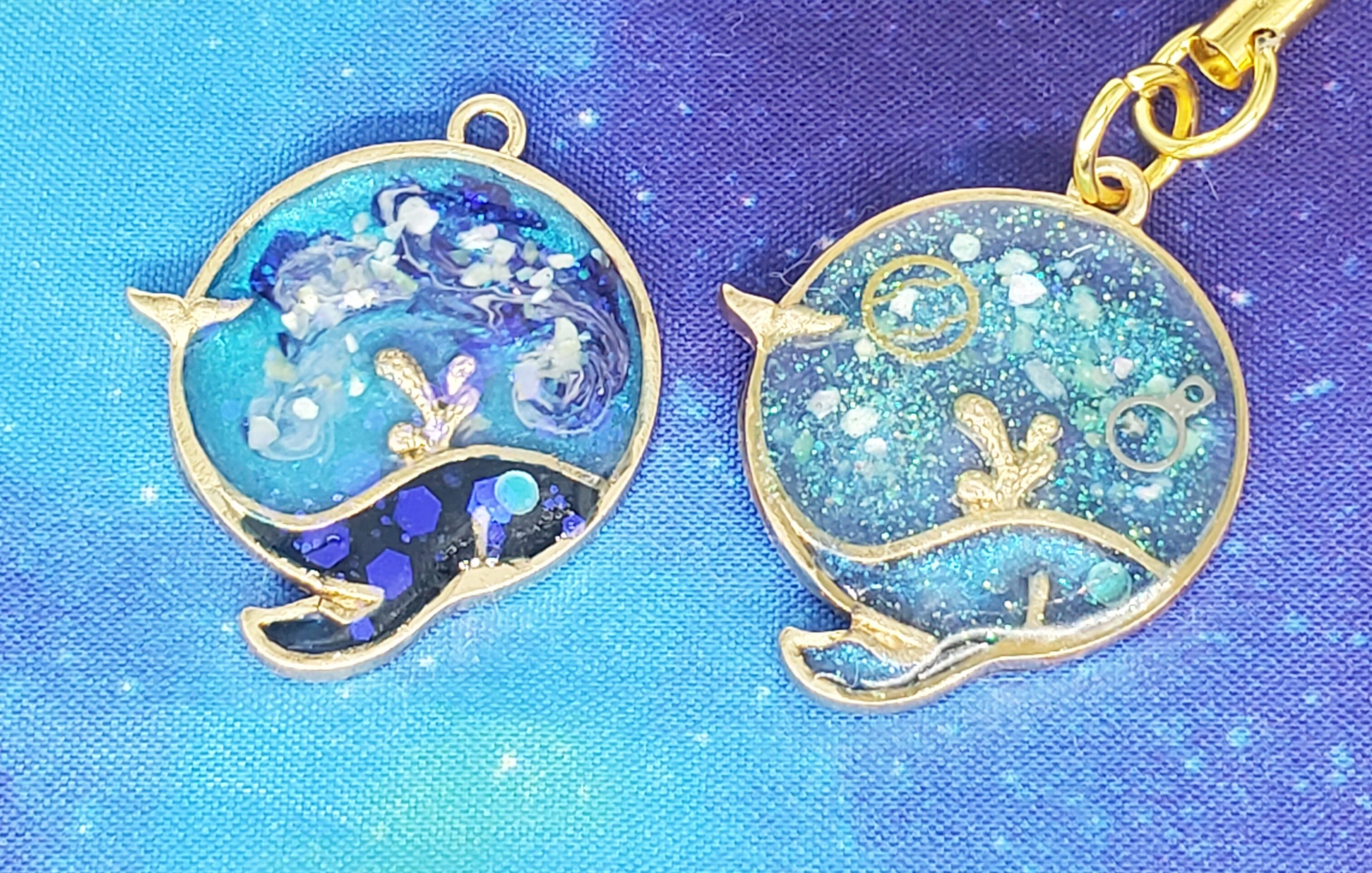 クジラ部分は青をベースに色をつけ、水色のラインストーンを目にしてます。