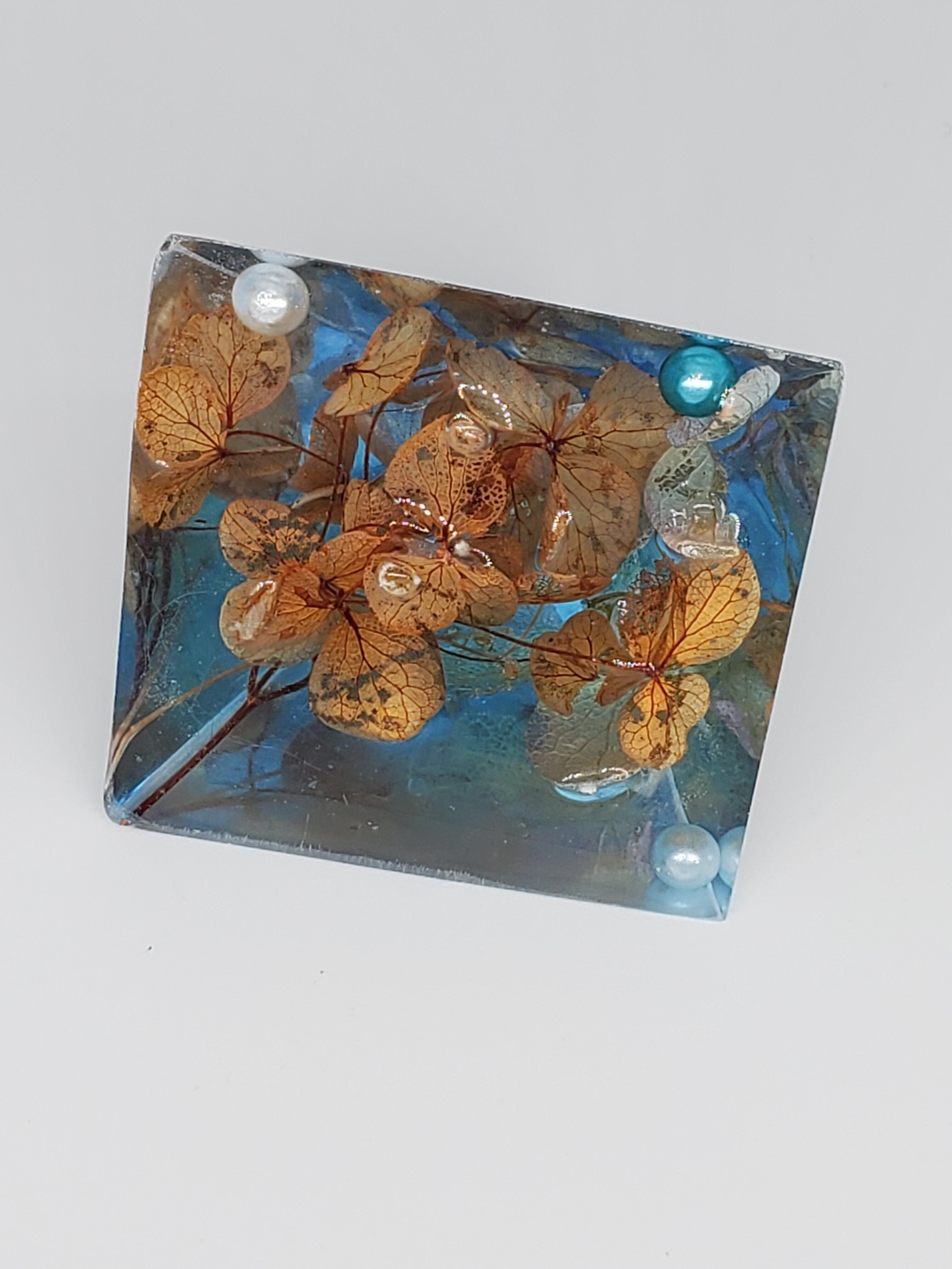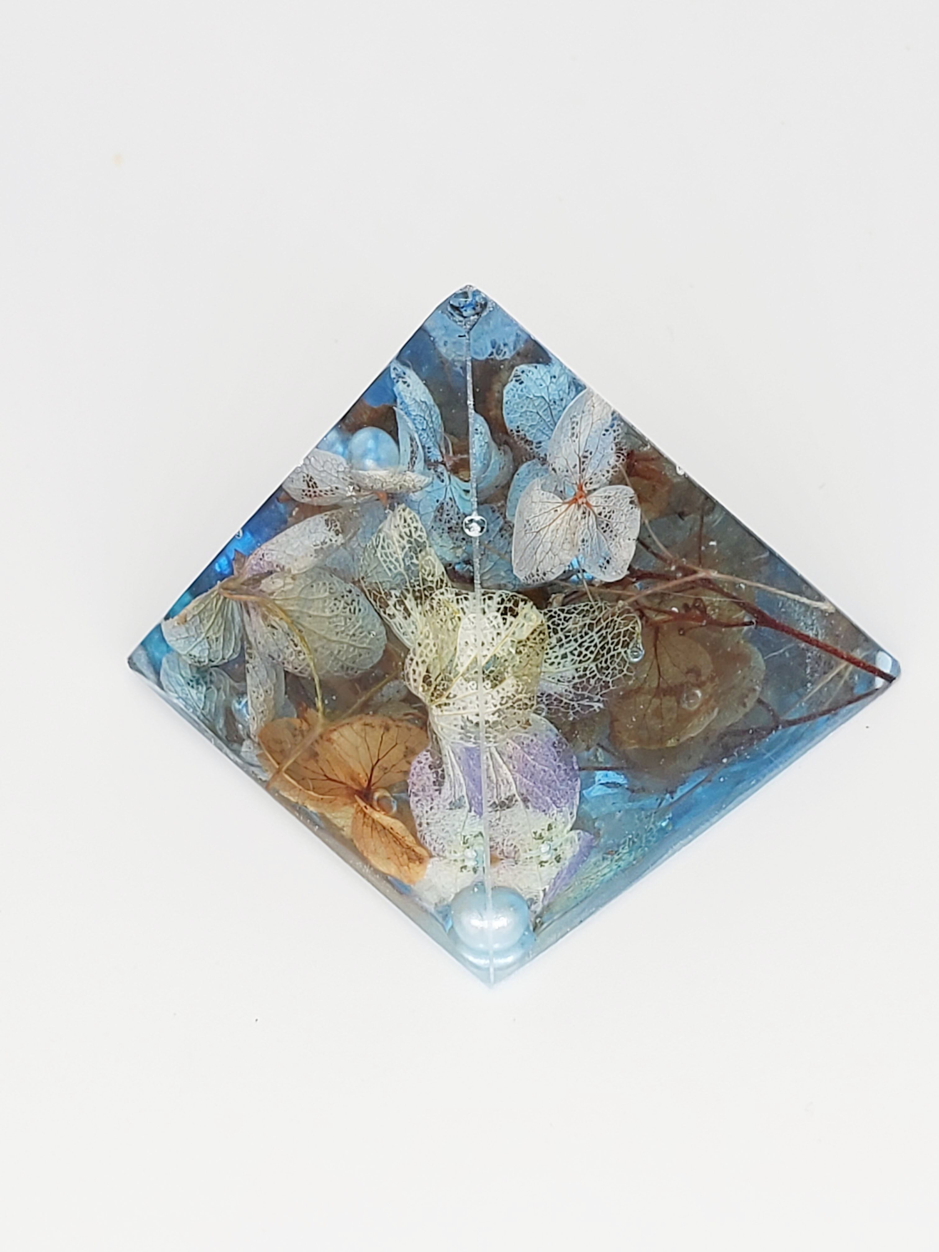 固まるハーバリウムに青と緑の着色をして、紫陽花を中心に花を入れてます。