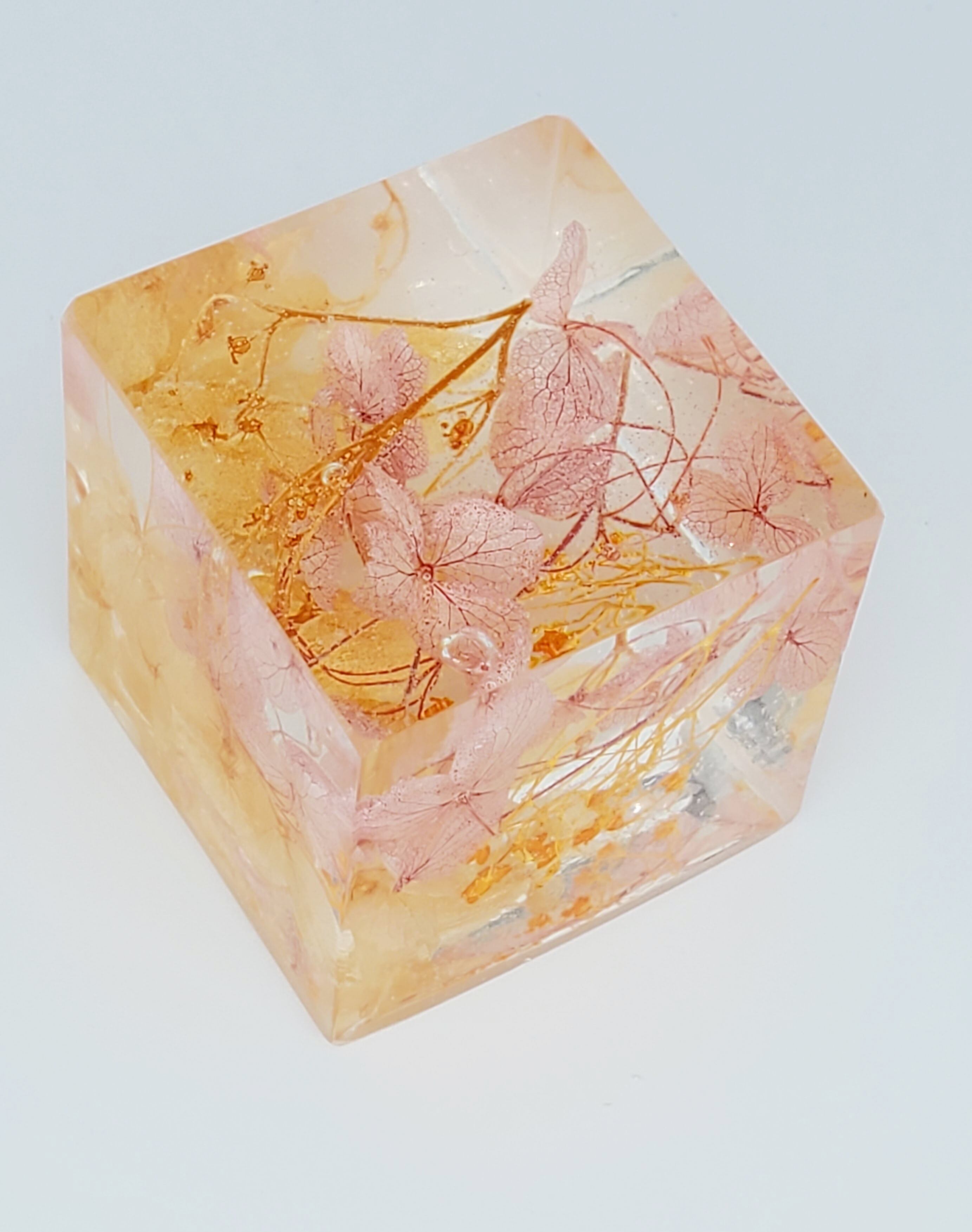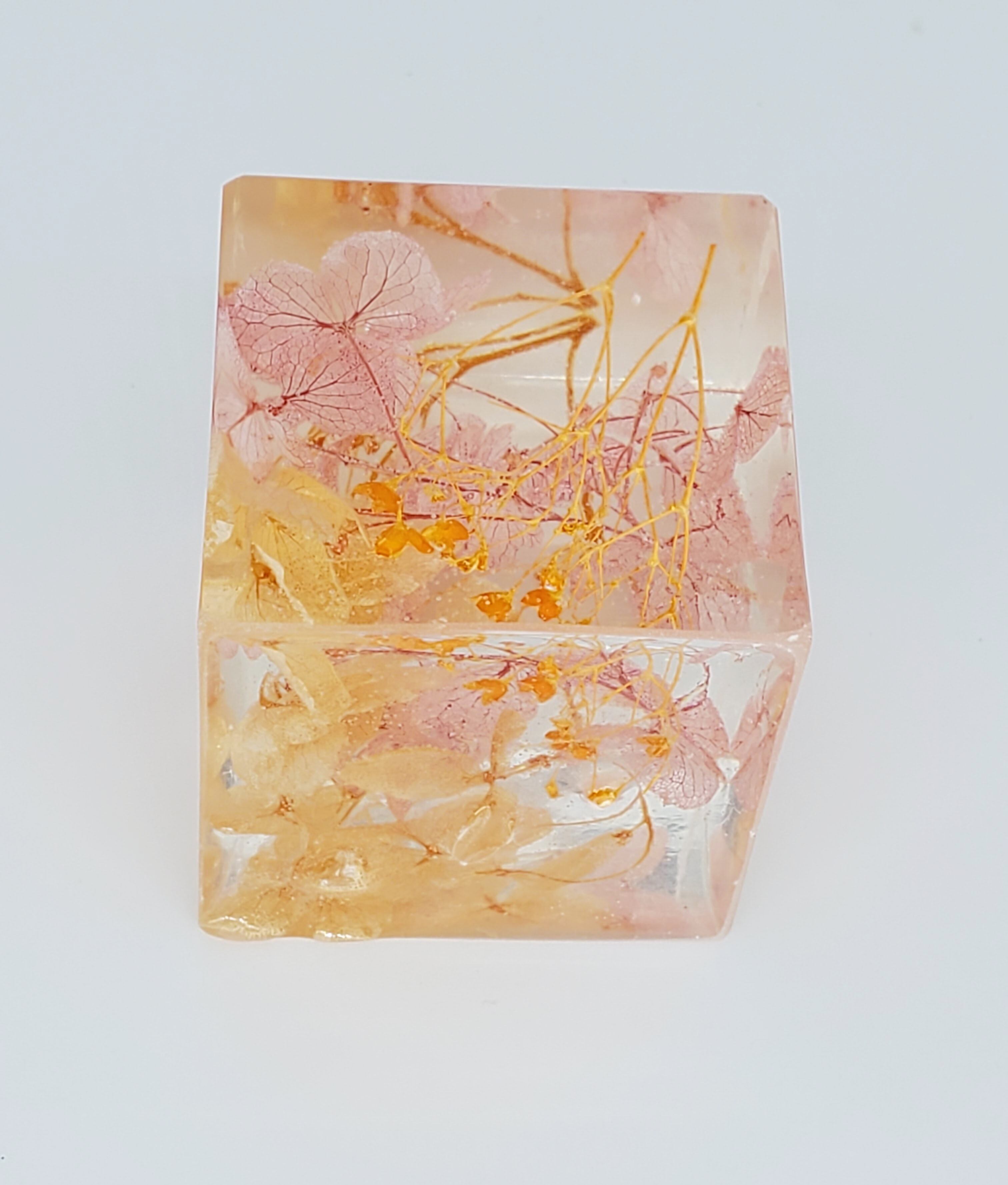 空が赤く染まりやすい、秋の夕日をイメージして花を入れて、固まるハーバリウムで固めてます。