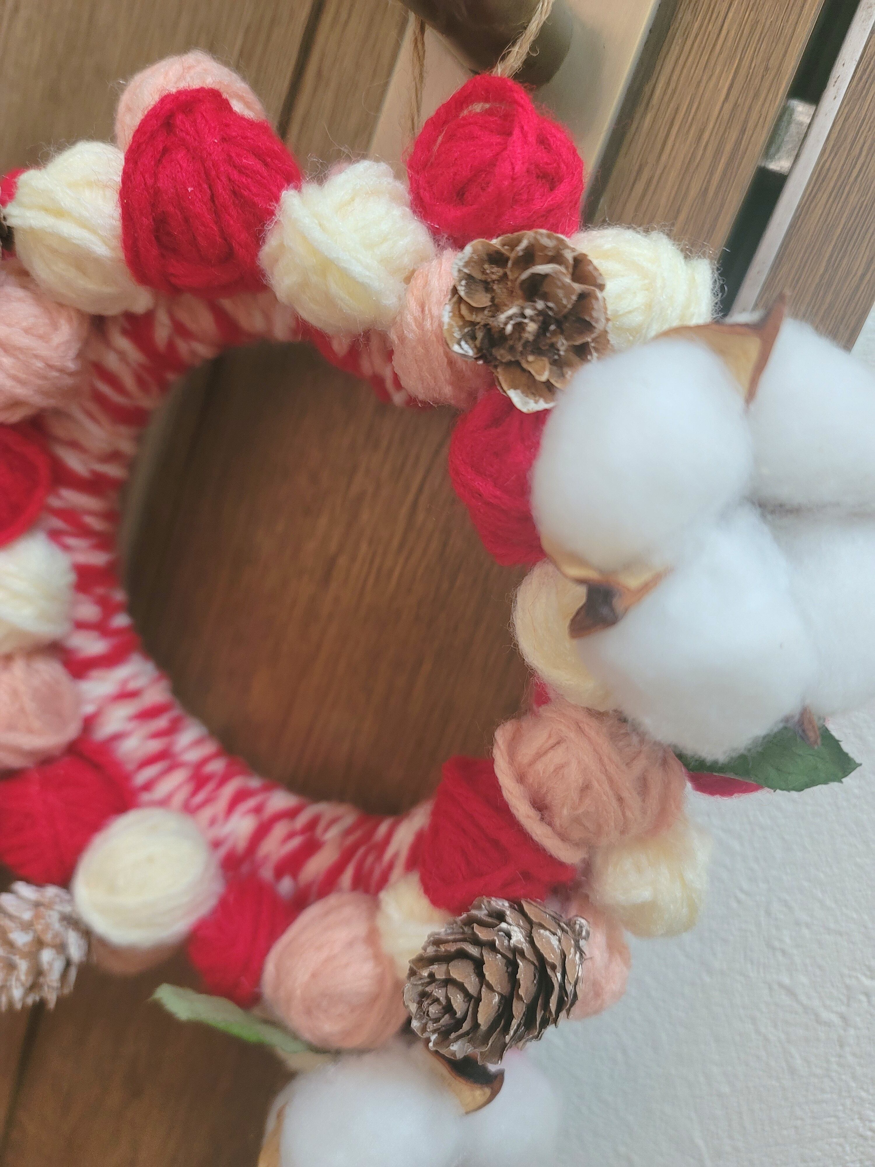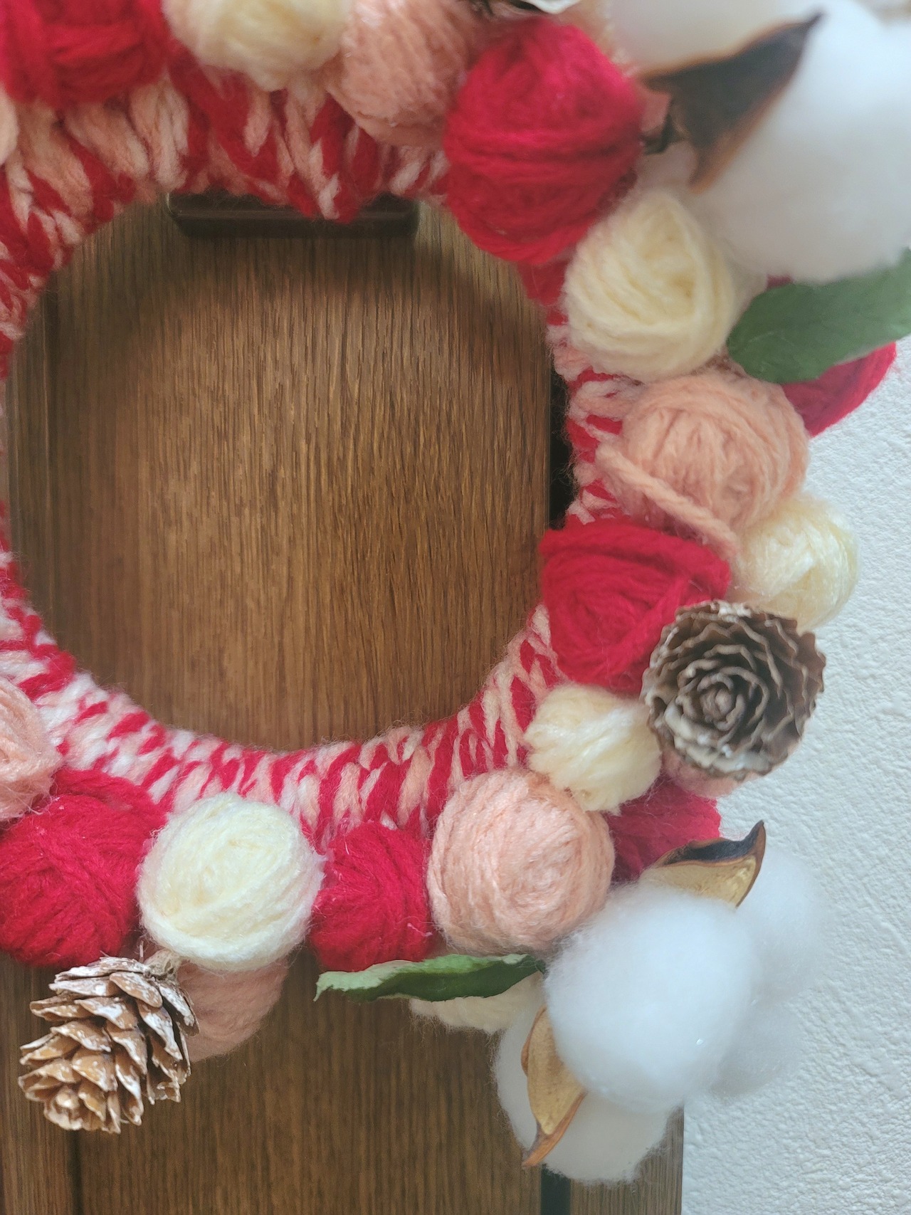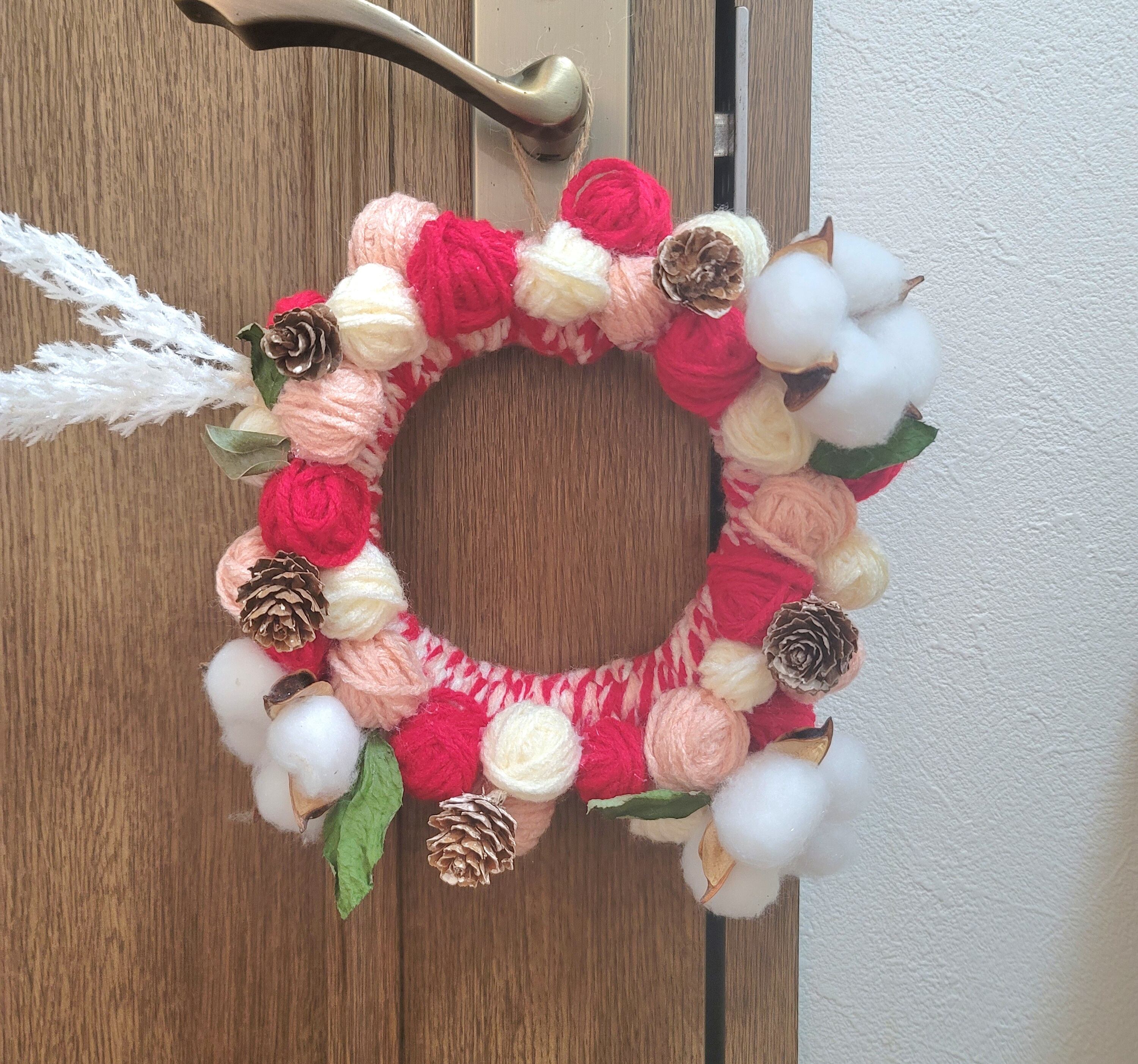 暖かみのある毛糸で編まれたリースです。季節感を演出するアイテムとして、玄関やリビングなどのインテリアにぴったりです。手作りの温かさとふんわりとした風合いが、心地良い雰囲気を演出します。